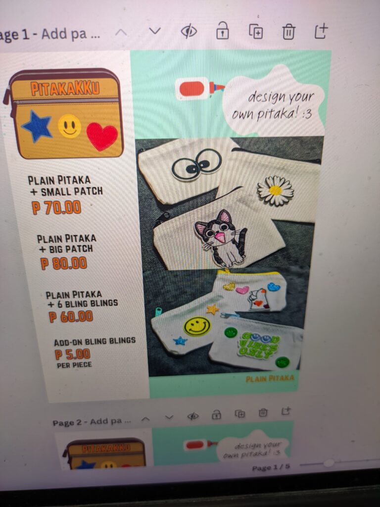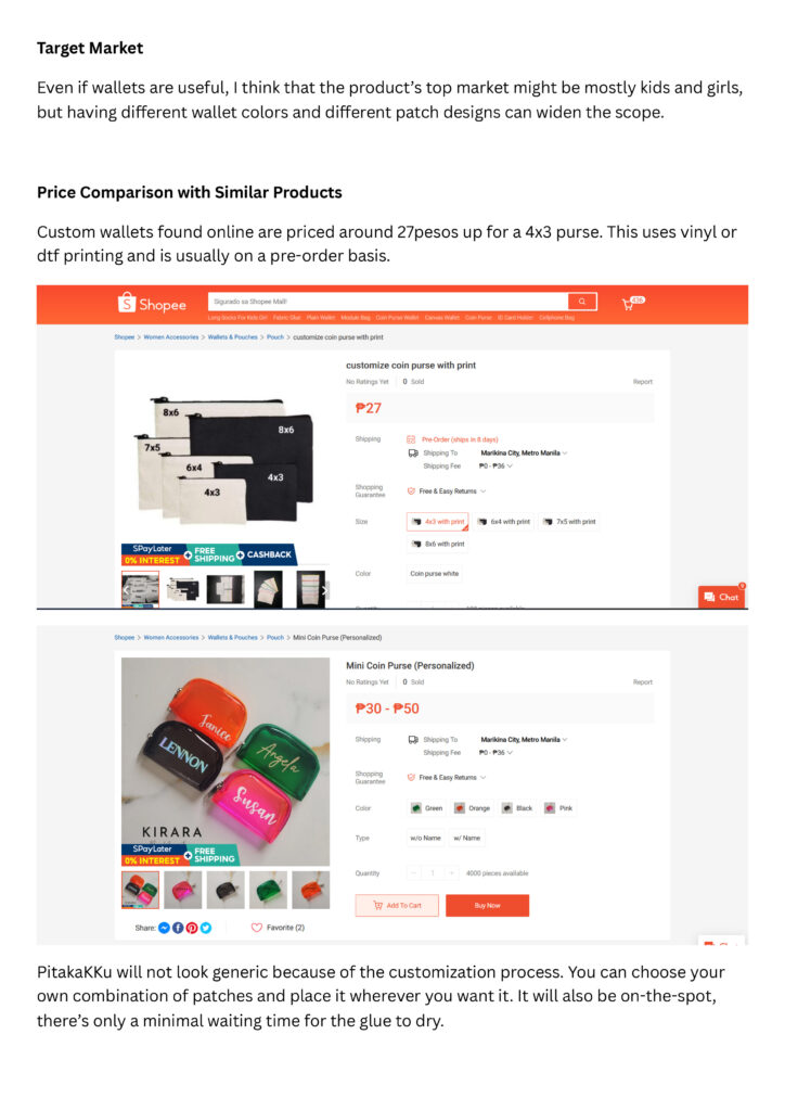 First, we had to find the materials we needed. We went on Shopee and Lazada to search for pouches and patches. We needed to find something cheap but still of good quality. When we finalized where to get our supplies, we then had to plan the initial quantity of our items.