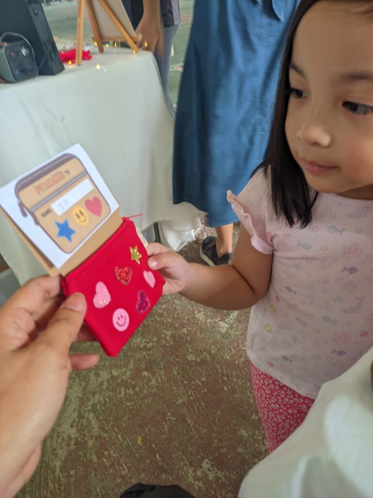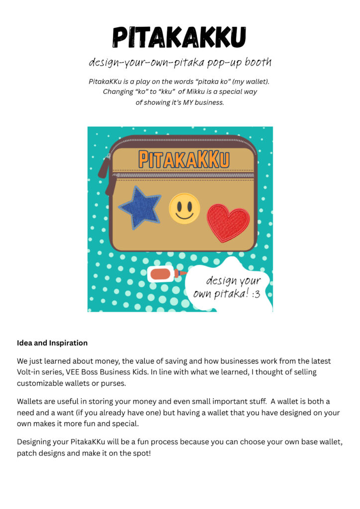 At first I thought of selling paper crafts, but then I wanted to sell wallets since we have been learning about money. I also want the buyers to be able to customize their wallets. So, with the help of my mama, I worked on my idea and sent my proposal.