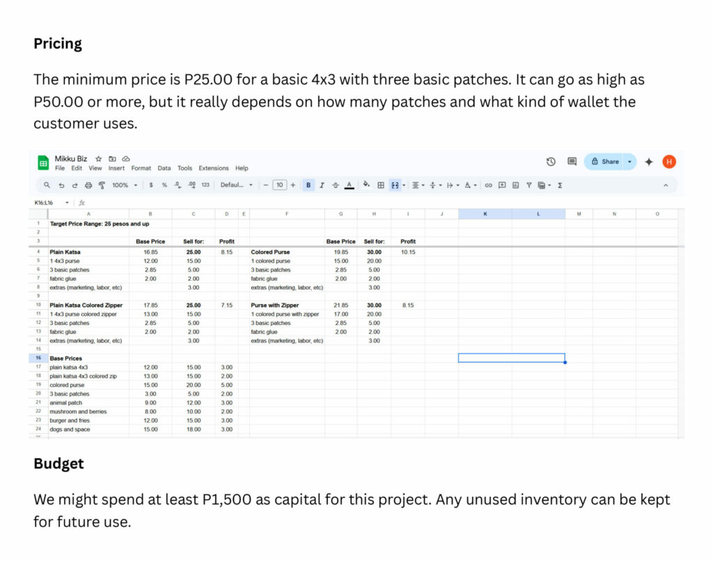 One of the hardest part of the business was the costing. We wanted to make sure our product is not too expensive for kids, but we also need to make sure we will profit. We needed to factor all the capital we will need and We also researched the prices of other custom wallets available online to help us figure out the cost. We had to edit and adjust our prices several times from the original cost proposal we submitted.